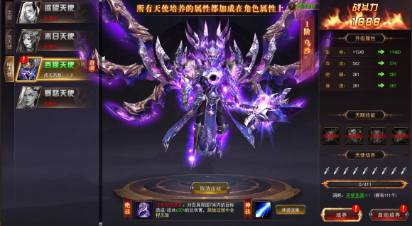 暗天使系充满毁灭与邪恶,欲望天使、末日天使、吞噬天使、暴怒天使,与光天使系相对立。而不管是光还是暗,我们都可以为之一用,E召唤光系天使,R召唤暗系天使,释放天使技能。天使技能不仅华丽炫酷,并且威力极大!每一位天使都能永久增加玩家属性。其阶数越高,增加的属性越多,也就是说玩家的战斗力将会获得相应的提升,招募的多名天使的战斗力和属性可叠加!