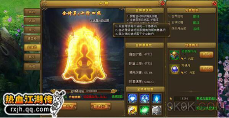 在腾讯《热血江湖传》中,金钟罩系统是游戏后期的核心玩法之一,每个玩家都对应有自己的金钟罩,可以使用道具对其进行升级进阶等操作,高级金钟罩不但可以为玩家抵挡伤害,还拥有多种不同的金钟罩技能。而相关道具则需要在金钟幻境的获得。