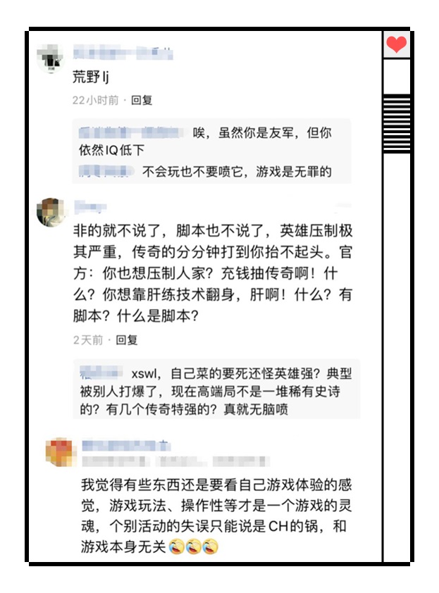 然而,在一些“游戏不好玩”的吐槽中,上一秒还在抱怨的玩家,这一秒就开始为游戏护短,回怼道:“虽然你是友军,但你依然IQ低下”、“不会玩也不要喷它,游戏是无罪的”、“自己菜的要死还怪别人英雄强”。温和点的读者则表示:“个别活动的失误是策划的锅,和游戏本身无关。”