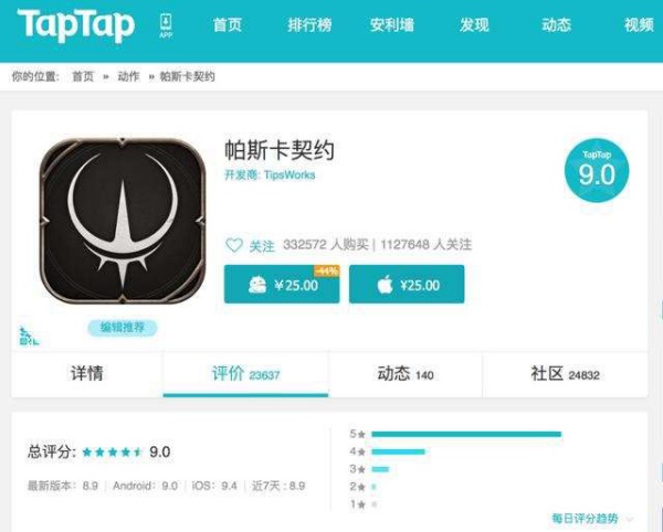 上线一个月时间,《帕斯卡契约》在TapTap销量达到30万。截至7月10日下午,共有332572人购买,评价超过2.3万条,总评分9.0分。按25元的售价计算,销售收入超过830万元。