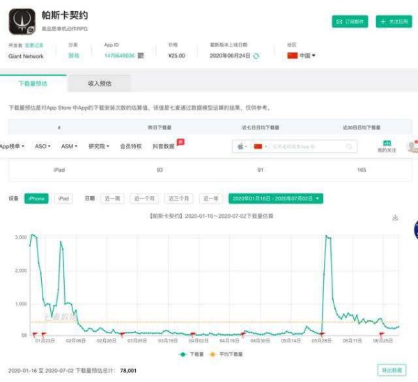 「子弹财经」在七麦数据查询了解到,《帕斯卡契约》1月16日-7月2日的iPhone下载量预估为7.8万,iPad下载量预估为1.68万。