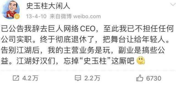 时年4月,在《仙侠世界》的内测发布会上,史玉柱即高调宣布:辞去巨人网络CEO一职。此后的4月11日,史玉柱在其个人微博上称:已不担任任何公司实职,终于彻底退休了,把舞台让给年轻人。