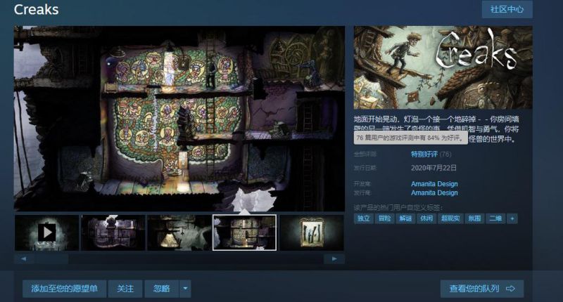 近日,又一款黑暗童话风格的独立游戏《嘎吱作响(Creaks)》正式在全平台发售,Steam售价78元。截止目前,该作在Steam上已经获得了84%的好评,这款游戏可以说是充分结合了黑暗童话与平台解密,既让游戏显得别具一格,同时在玩法上也颇具乐趣。
