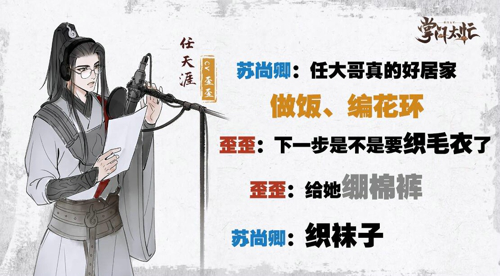 当看到任天涯还会编花环时,就连苏尚卿(唐瑭CV)都忍不住感慨了,任大哥真的好居家,做饭、编花环,这怎么样样都会,歪歪(任天涯CV)也是接着说道,接下来就该织毛衣了,这么贤惠的任大哥,哪个玩家还能忍住不心动?