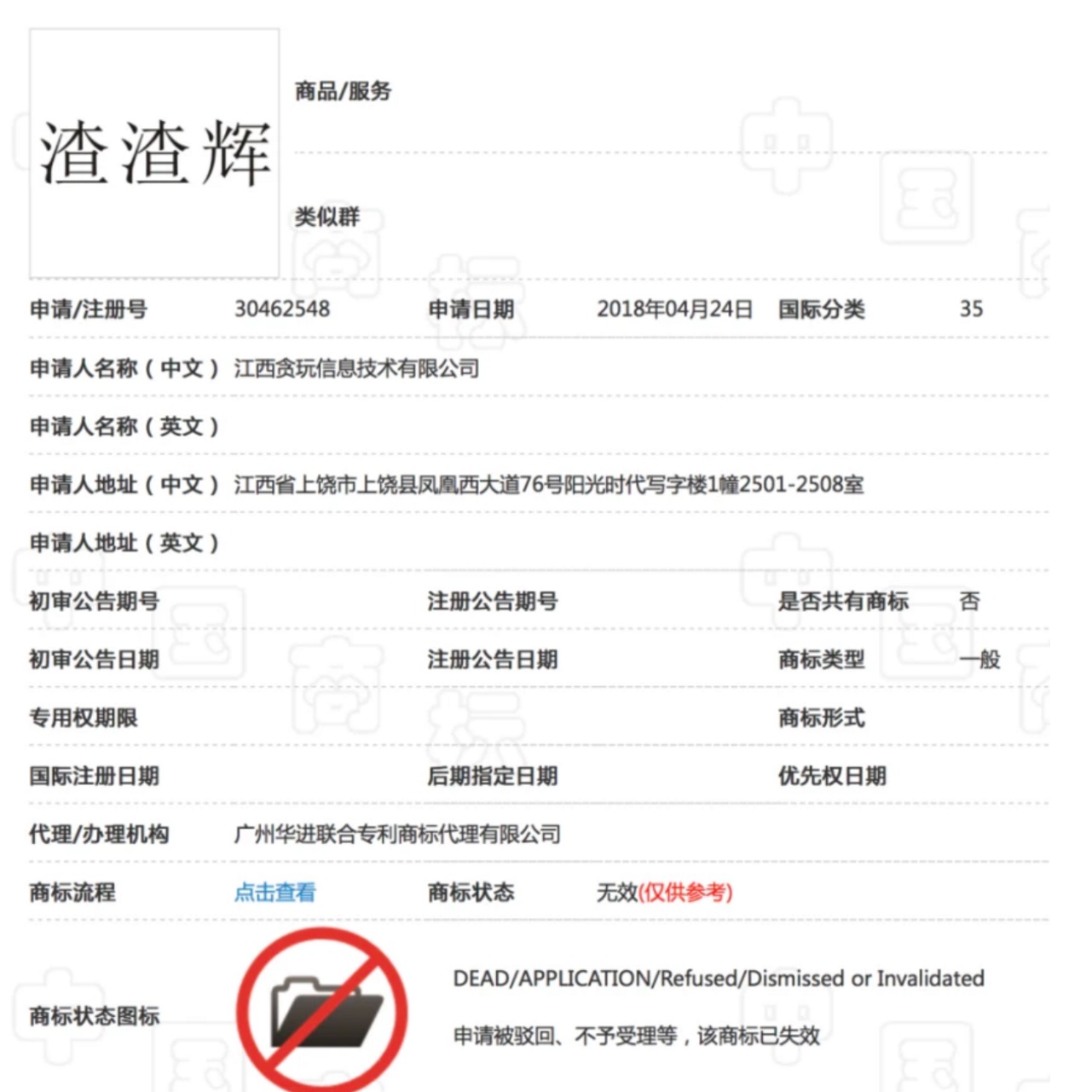 看到商机的贪玩公司于2018年4月就第一次申请注册了「渣渣辉」商标,但在后来被商标局驳回,因而诉至北京知识产权法院,但又因其是诉争商标而被驳回。