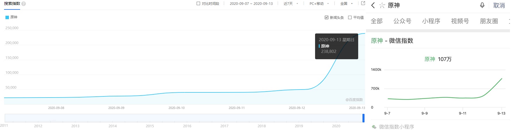 在上线前不久,玩家们便开始为之躁动。8月28号之后,游戏的百指突然上涨到1.5万,随后慢慢涨到4万左右,在9月13号开放预下载之前,百度指数突然上扬,飙到了23.8万。在微信里,“原神”二字的搜索指数,也迎来了一波翻倍式的上涨,飙到了107万的水平。