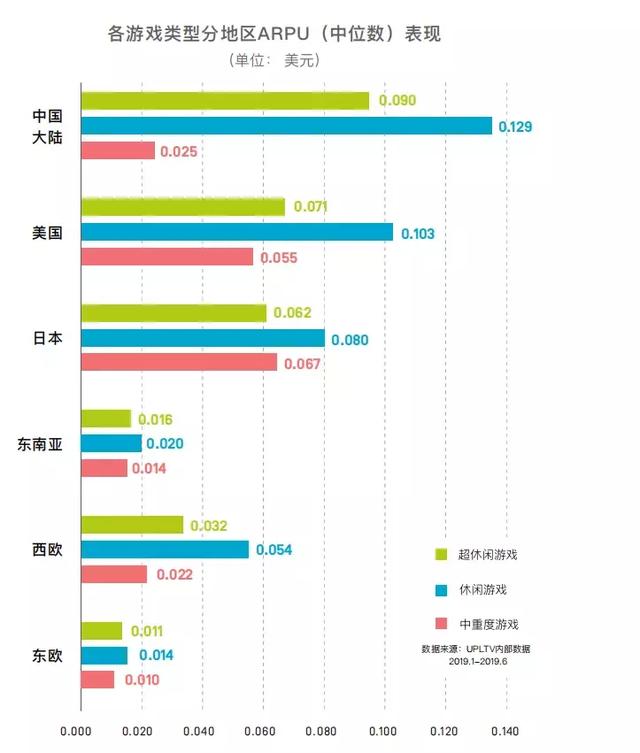 超休闲、休闲和中重度游戏在2019年上半年eCPM趋势波动大致相同,ARPU值最高的是休闲游戏,因为其广告强度高于中重度;主要依靠内购来营收中重度游戏的广告ARPU值则是最低的。