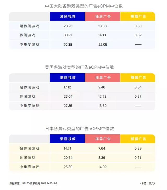 近日,UPLTV发布了2019年上半年的移动游戏广告变现洞察报告,通过分析UPLTV接入的2500多款游戏数据,报告分析了不同类型的广告、不同类型的游戏、和不同地区的广告相关数据表现。