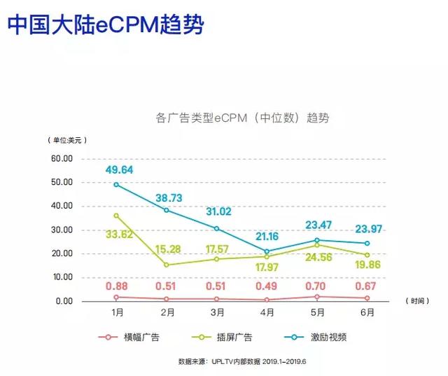 在全球几个主要地区中,中国大陆的广告变现表现十分出色,激励视频eCPM水平在30美元左右,插屏广告eCPM水平在20美元左右,最高峰均出现在一月份。