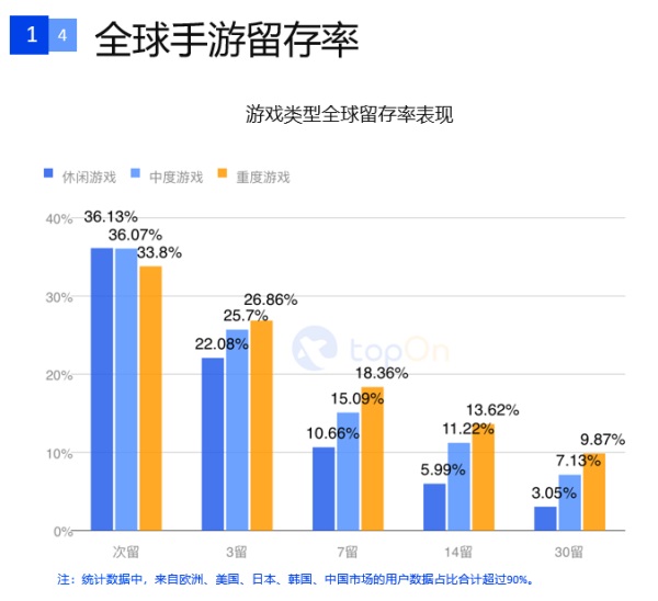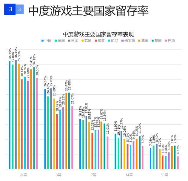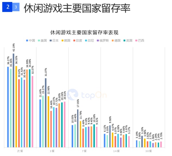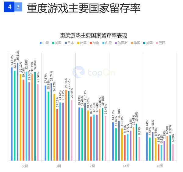 留存率方面,重度游戏次留普遍比休闲、中度游戏低,但由于其游戏特性,整体用户流失率较二者更低,用户粘性更高。日本为重度游戏留存率之首,巴西次留最低。