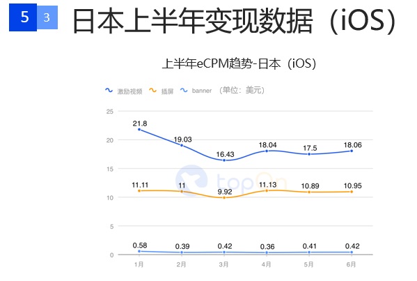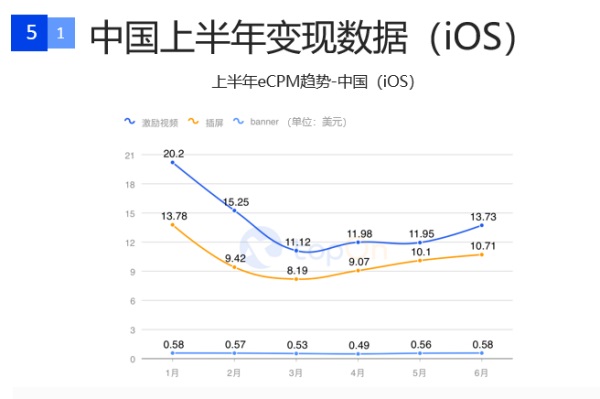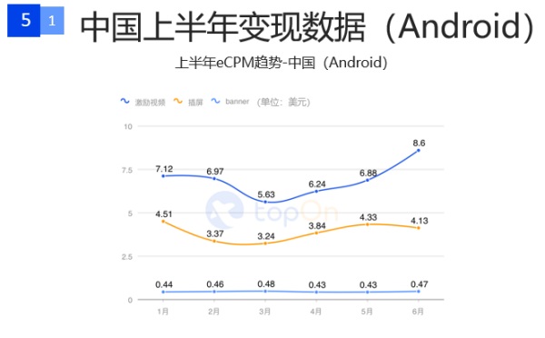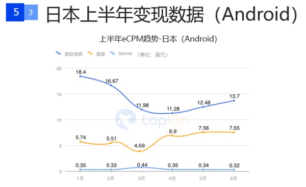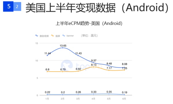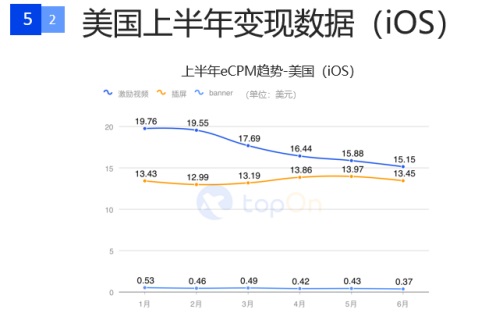 美国地区Android端激励视频的eCPM受疫情影响明显,4月份开始大幅下滑,4/5/6月份的eCPM降至与插屏相差无几。iOS端激励视频则从3月份开始也逐步下滑,反之插屏广告从3月份开始eCPM缓步上升。