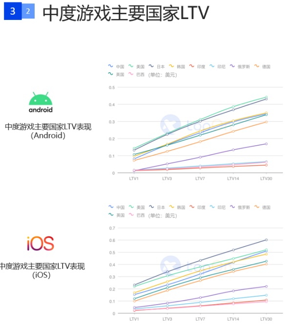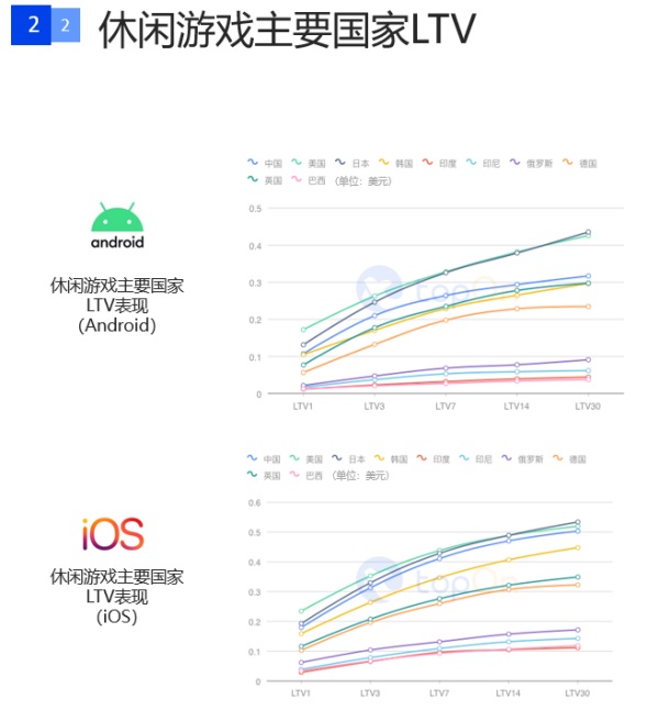 LTV表现上,iOS端表现最好的是日本,Android端则是美国,中国的双端表现均为第四,两印地区、巴西的中度游戏表现均比较一般,其中印度双端最差。