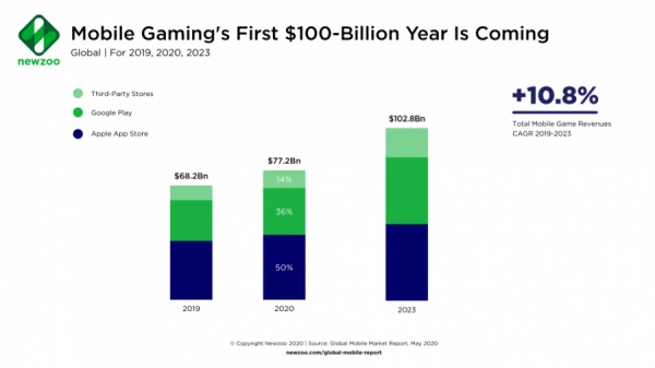 COVID-19的大流行给全球经济造成重创之际,全球移动游戏领域却迎来了新一波增长。Newzoo最新数据显示,在全球范围内,手机游戏市场今年将产生772亿美元的收入,同比增加+13%。App Store今年将产生388亿美元的移动游戏收入(同比增长10.3%),来自Google Play的游戏收入在2020年也将达到278亿美元(同比增长15%)。此外下载量方面,国内外多项数据均显示,2020年上半年全球移动游戏下载量将创下历史同期新高。