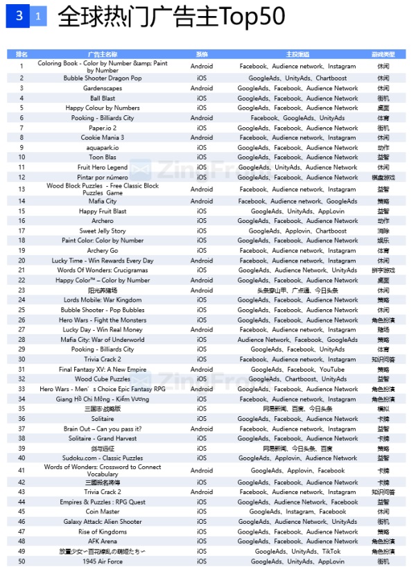 ZingFront还盘点了全球热门广告主Top 50,其中榜单前三均为休闲类游戏,绝大多数为iOS游戏,Android游戏只占15席。网赚类游戏在买量上也有着十分不错的表现,国内外最为典型的代表分别为【阳光养猪场】、【Lucky Day - Win Real Money】;色彩填充类上也十分值得关注,榜单中共有5款该类型游戏,其中榜首【Coloring Book - Color by Number & Paint by Number】累计投放超过220天收获了超过220w的超高热度值。