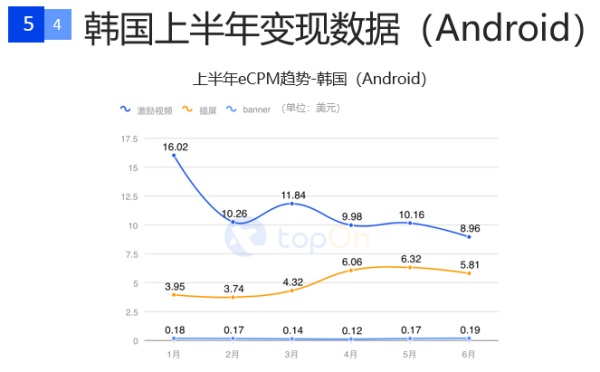 韩国地区Android端从2月开始激励视频eCPM下降明显,而插屏从3月开始缓步上升。iOS端激励视频整体较为平缓,2月降至最低后趋于稳定;插屏广告的eCPM从3月开始对比1、2月显著增长。