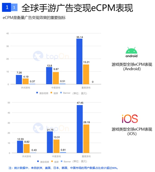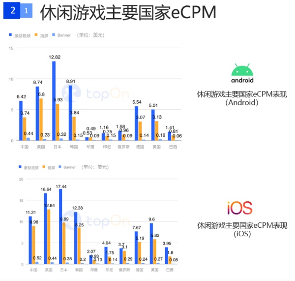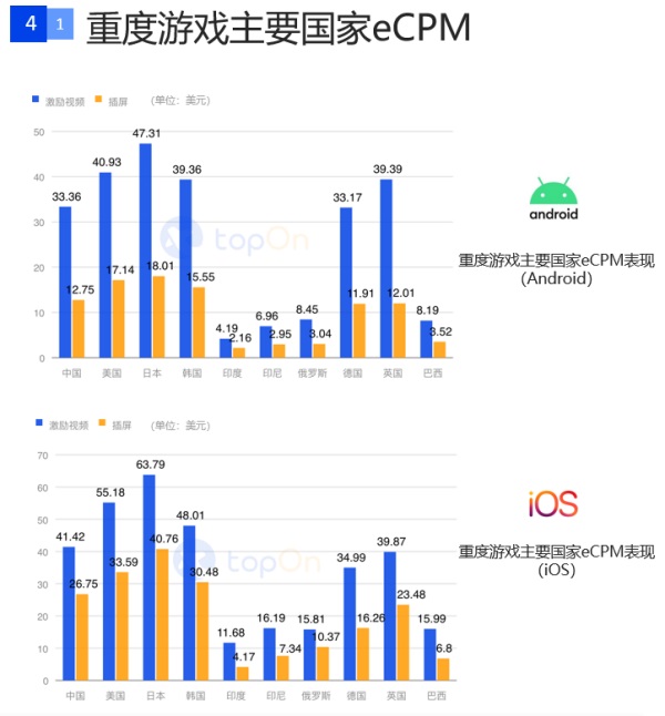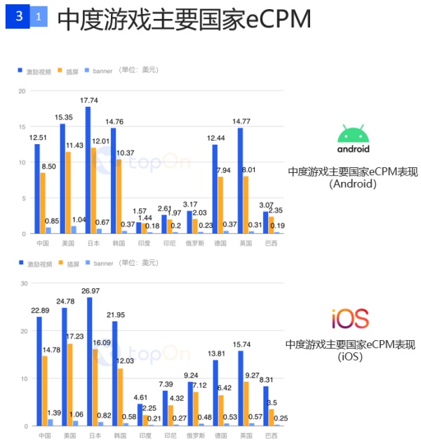 由于重度游戏以激励视频为主,因此各地区激励视频的eCPM更有参考价值,双端的Top3地区为日本、美国、韩国;中国在重度游戏领域,各项eCPM表现已经与欧洲地区表现相近甚至略微领先,间接体现中国用户价值已经开始逐渐追上发达国家地区。