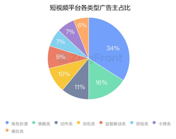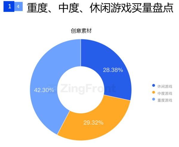游戏类型方面,重度游戏广告素材量占总素材量的42.30%,休闲和中度游戏素材占比相近,约占总计素材类型的3成。