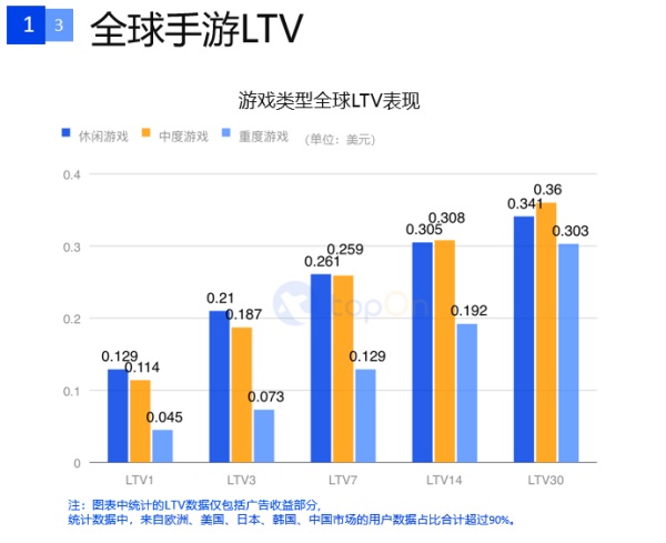LTV作为表现用户在游戏生命周期内所创造的收益价值的重要指标,同样适用于表现用户在游戏中贡献的广告收益。从TopOn给到的数据来看,前期休闲游戏LTV最高,但中度游戏长留存更好,后期逐渐赶超休闲游戏,重度游戏的eCPM虽然显著高于其他游戏类型,但由于其收益主要来源于内购部分,激励视频更多作为辅助其提高用户粘性、加强用户氪金力度的工具,因此广告LTV表现并不高。