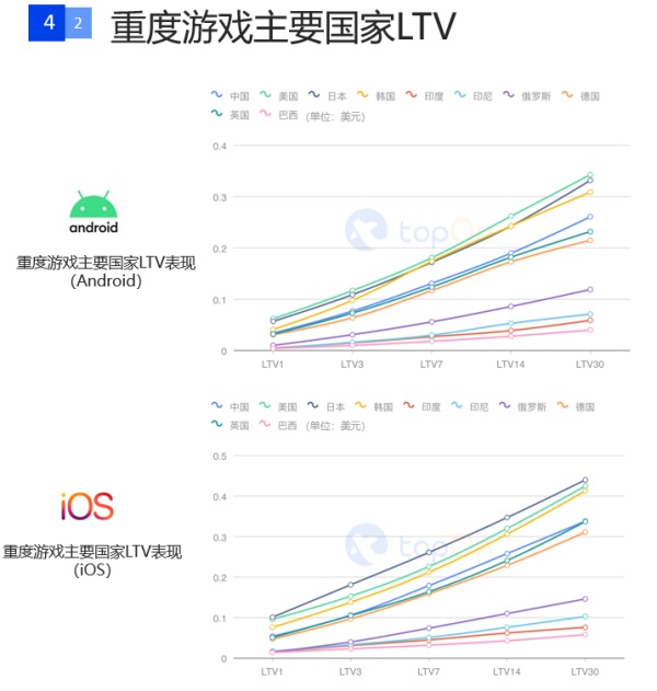从LTV来看,日本、美国、韩国用户价值领先全球,Android端LTV30均高于$0.3,iOS端LTV均高于$0.4。其中日本在iOS端表现最好,美国则在Android端全程领先。两印地区、巴西的重度游戏表现继续延续中度游戏表现,比较一般。