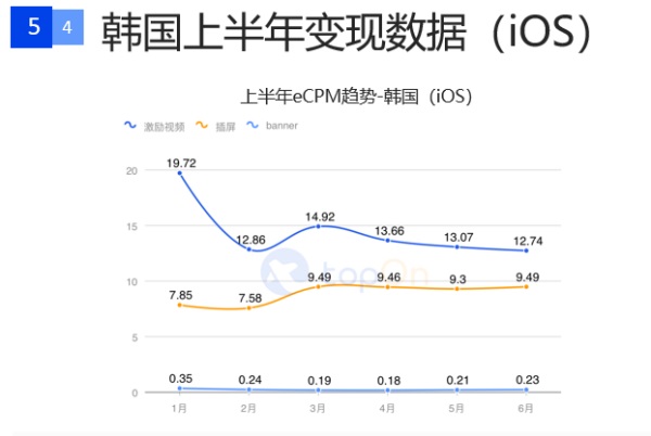 日本地区Android端激励视频的eCPM同样受疫情影响,3月份开始大幅下滑,此后eCPM呈缓步回升状态;与美国地区一样,插屏广告从4月开始上涨。iOS端的eCPM受疫情影响不明显,整体表现较为稳定,且价格为全球最高。
