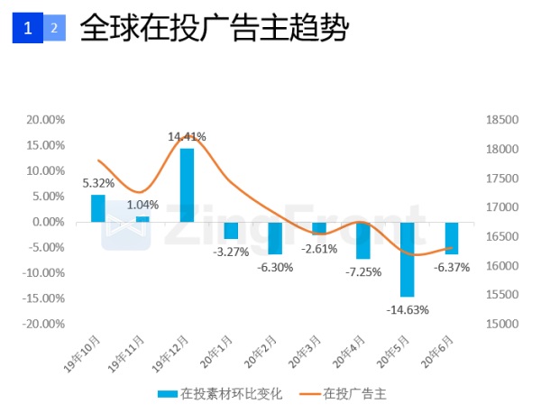 美国因疫情爆发和其国内社会环境因素,在投素材数量在5月份的时候开始下降;中国自3月以来广告主数量与素材数量开始下降,到6月才开始出现回升迹象;日本在20年2月以后由于疫情原因,在投广告主环比持续下降,韩国在2月份的时候投放素材小幅上扬,但自3月份也开始下降,不过随着疫情得到稳定控制,均在6月出现回升;欧洲市场则比较另类,英国进入2020年后变化幅度不大,甚至小幅上涨,德国则在5月份略微下降,但也比较稳定;新兴市场中,两印均自3月份出现明显下降,巴西尽管疫情严重,但其政府并无制定强制隔离政策,因此在投广告主、素材数量走势整体向上,俄罗斯则受疫情爆发原因,4月在投广告主也小幅下降,但在5月份有显著的提升,后续保持较为平稳。