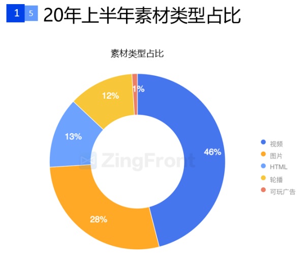 投放的广告素材类型上,视频类素材占比最高,达46%,其次为图片类素材,占比28%。随着全球移动网络的发展和流量资费的降低,动态素材的占比将越来越高,20年起占比已经接近一半。