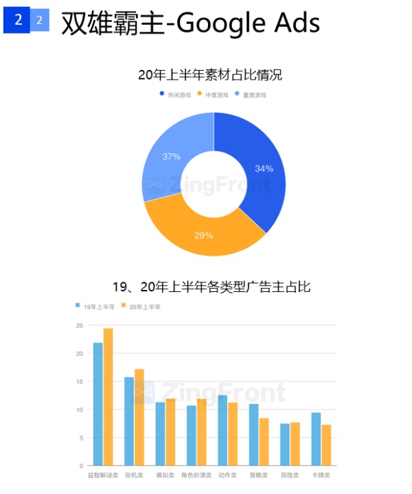 在投放渠道方面,Google Ads和Facebook分别是Android和iOS平台最为重要的投放渠道。对比而言,投放Google Ads的游戏类型较为均衡,休闲、中度、重度游戏占比分别为34%、29%、37%,其中广告主数量占比、增长最多的细分游戏类别为益智解谜类,20年上半年比19年同期增长了2.56%;