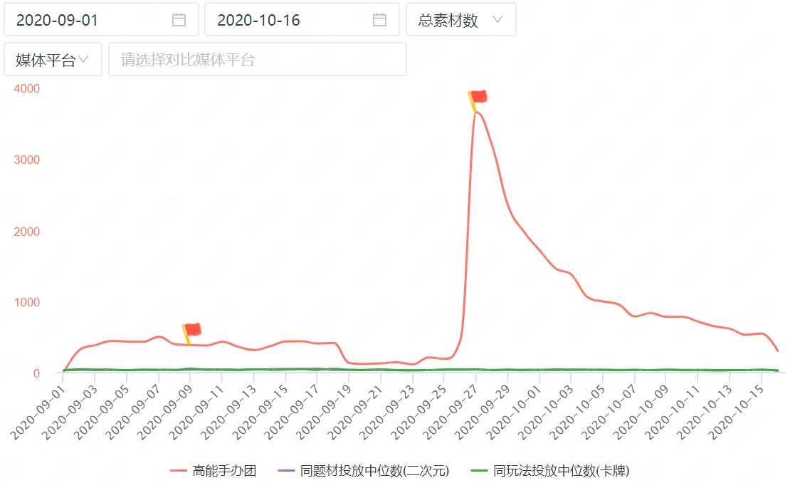 根据Dataeye平台显示,截止发稿日,《高能手办团》累计投放累计65天,其中游戏预热期40余天,迄今消耗总素材数过万组,投放峰值素材数3646组,从投放力度来看力超同期众多二次元手游。