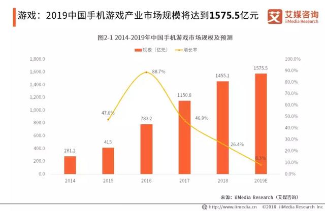 iiMedia Research(艾媒咨询)数据显示,2018年中国游戏市场规模达2144.4亿元,同比增长5.3%,但与2017年相比增速有所回落。从手机游戏规模来看,2018年中国手机游戏市场规模接近1500亿元,较2017年增长26.4%,而对于游戏行业整体而言,2018年增速仅为5.3%。