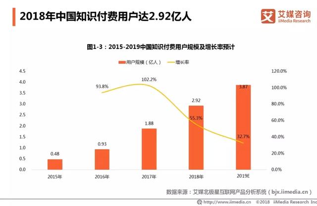 自2016年知识付费元年以来,中国知识付费用户规模呈高速增长态势。iiMedia Research(艾媒咨询)数据显示,2018年知识付费用户规模达2.92亿人,预计2019年知识付费用户规模将达3.87亿人。艾媒咨询分析师认为,随着移动支付技术的发展和整个社会对知识的迫切需求,知识付费市场不断扩大,用户逐渐养成知识付费的消费习惯。