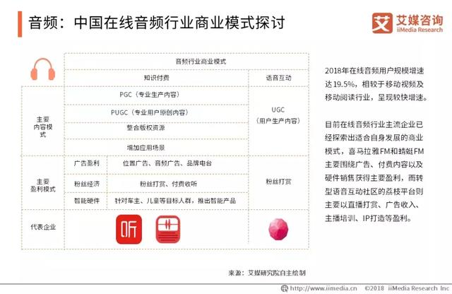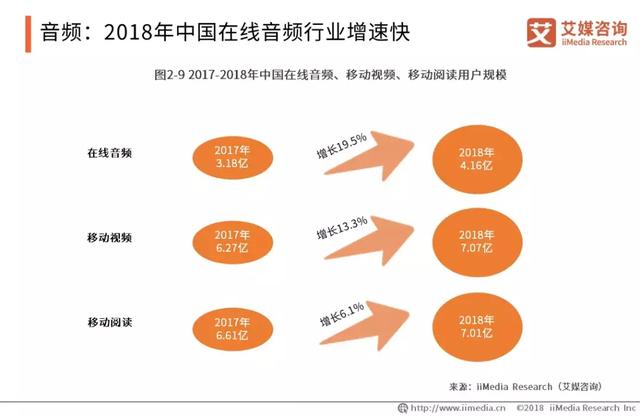 2018年大力扶持文化产业的发展,为在线音频行业创造了良好的政策环境,加上一系列社会环境变化也为在线音频行业的发展带来机遇。iiMedia Research(艾媒咨询)数据显示,2018年中国在线音频用户规模达4.16亿,在 2017年基础上增长19.5%。相较于移动视频、移动阅读行业,通过音频载体输出内容的在线音频行业呈现更快发展势头。
