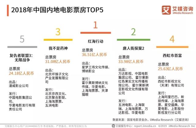 根据报告,2018年,中国内地电影票房排名前5位分别为《复仇者联盟3:无限战争》、《我不是药神》、《红海行动》、《唐人街探案2》以及《西虹市首富》;总票房分别为24.18亿人民币、31.08亿人民币、36.51亿人民币、33.98亿人民币、25.63亿人民币。