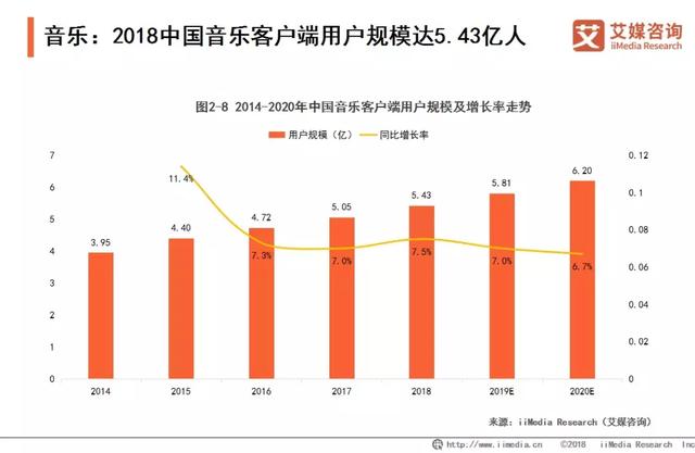 在线音乐是兵家必争之地。经历多年业务与资本的角逐,如今中国手机音乐客户端市场也已然进入了一个相对成熟的阶段。iiMedia Research(艾媒咨询)数据显示,2018年中国音乐客户端用户规模累计达5.43亿人,预计2019年将达5.81亿人。