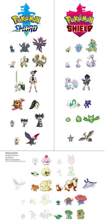 上半图为目前已经确定剑和盾版特有的宝可梦,下半图则是推测的版本宝可梦,目前尚未确定。