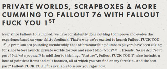 在这个山寨网站中,这位玩家将介绍改成:“自从我们的《辐射76》发售以来,我们就一直不作为,什么也不改进,你们玩家给出的沙雕反馈也没啥用。然而,这就是为何我们要推出《辐射76》***会员的重要原因。《辐射76》***会员专门为沙雕网友提供,好让他们和自己的白痴朋友们一起搞事。。。”(由于有些字眼过于不雅,因此不能过多翻译,感兴趣的玩家可以点击此链接自行查看。)