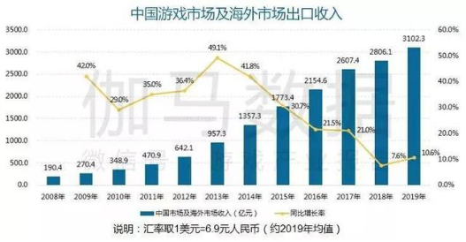 与《意见》中所发出的积极信号相得益彰的是中国游戏产业回暖。根据伽马数据发布的《2019中国游戏产业年度报告》可以看出,2018年至2019年,中国游戏市场收入一直呈现增长形势,2019年中国游戏市场和海外市场出口收入整体增速再次提升,收入超过3100亿元,增幅达到10.6%。