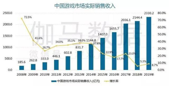 其中,中国游戏市场实际销售收入2330.2亿元,增速为8.7%,也较去年增速有所回升。