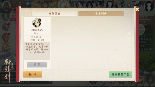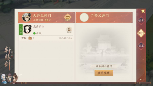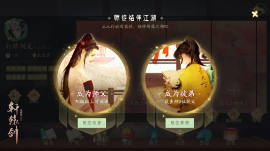 少侠可以进入师徒界面,通过发布拜师广告前往拜师,也可以在招募系统挑选自己的心仪弟子。另外,等级超过70级的侠士依然可以选择拜师深造,虚心修行。除了师徒招募平台,少侠也可以通过点击其他少侠的头像来选择直接拜师或收徒,缔结师缘。