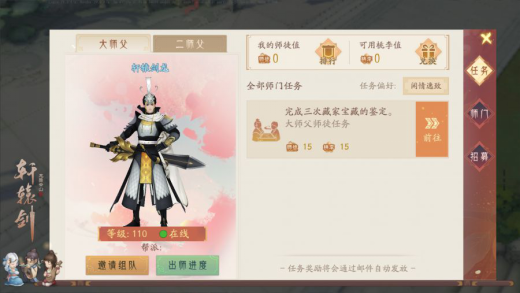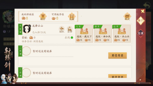 定立师门后,师父可以指派任务,指导门下的徒弟日常修行。而徒弟也可以根据自己的修行意愿向师父反馈,以选择更适合自身的修行之路。徒弟每天完成师父发布的任务后,师徒双方都将获得大量奖励。所以各位师父还需尽心指导、协助徒弟完成指派的任务,才可使师门更加发扬光大,闻名天下。
