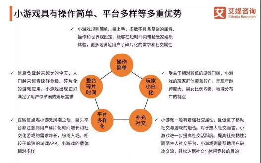 3、2018年小游戏日活用户数超1亿,人均日使用时长13分钟。小游戏拥有休闲、社交、竞技三大特点。