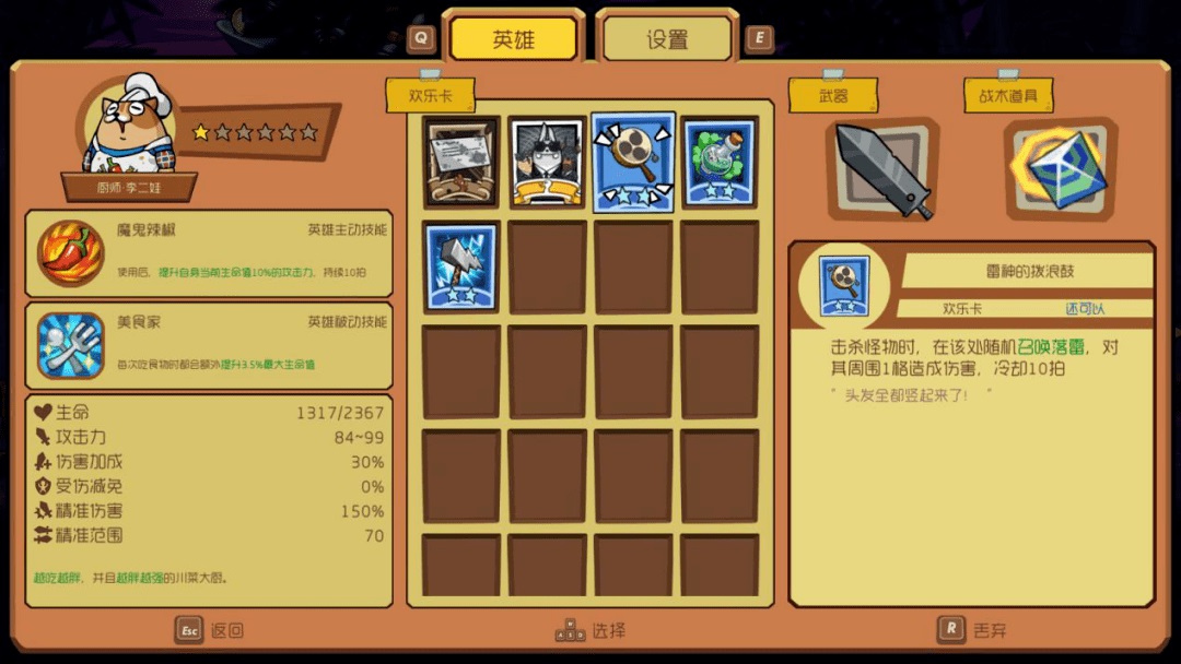在此之上,《节奏快打》还加入了欢乐卡的设计。玩家在战斗中,可以收集到拥有各类效果的技能卡。这些卡普遍能提供一些被动能力,配合玩家的人物技能及参数,能发挥奇效。欢乐卡的加入,为玩家增添了很强的取舍乐趣,直接强化了游戏的策略深度。