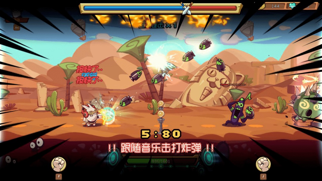 《节奏快打》的玩法核心也正在于此,虽然玩家在游戏中执行的还是攻击、闪避、放技能、左右移动这些常规操作。但每一种操作,伴随着音乐与按键时机,都存在着相应的判定。玩家必须跟随音乐节奏,看着下方的节奏UI,按韵律来完成动作。伴随着玩家的每一步行动,角色头顶都会冒出“精准”、“还行”、“按快了”等提示,这完全就是音乐游戏那套熟悉的精准按键操作。