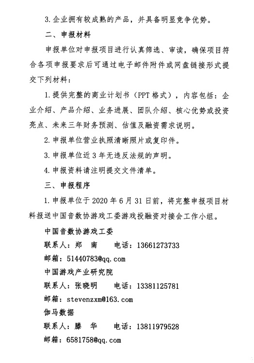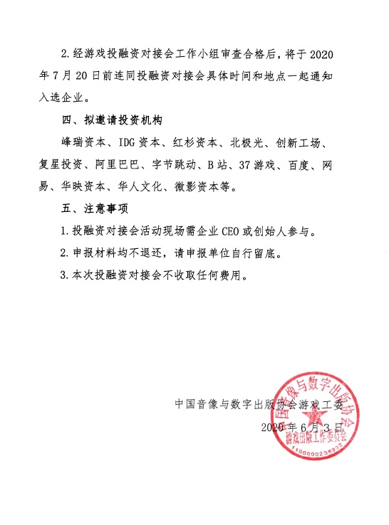 2.经游戏投融资对接会工作小组审查合格后,将于2020年7月20日前连同投融资对接会具体时间和地点一起通知入选企业。
