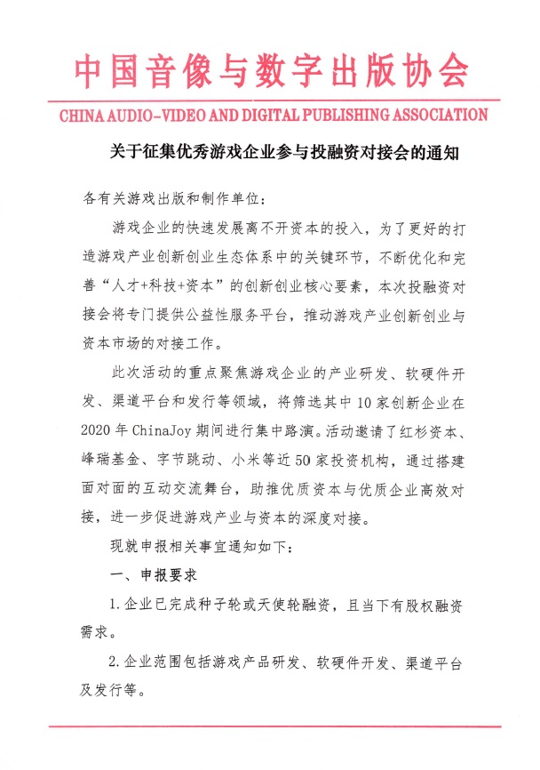 关于征集优秀游戏企业参与投融资对接会的通知
