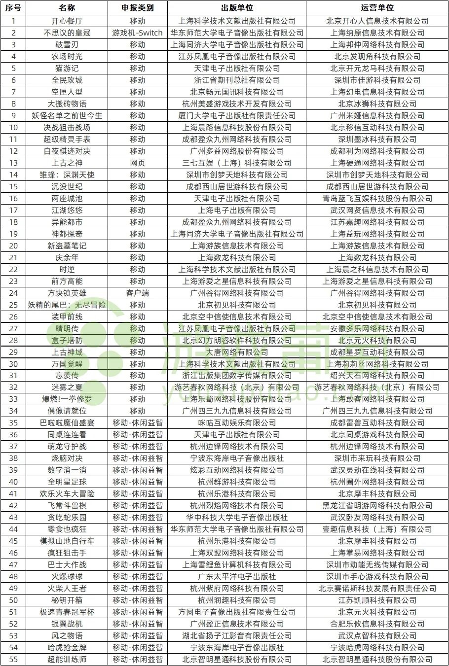 6月15日,版署下发了本月首批国产游戏版号。此次过审游戏共55款,包括52款手游(其中21款为「移动-休闲益智」),1款客户端游戏,1款网页游戏和1款NS游戏。