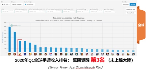Sensor Tower数据显示,2020年第一季度,《万国觉醒》全球收入位列第三名,排在它前面的两位,分别是战术竞技手游《PUBG MOBILE》和MOBA手游《王者荣耀》。