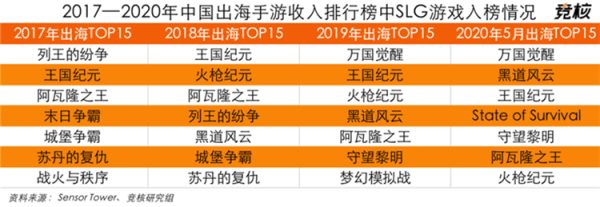笔者整理Sensor Tower、长城证券数据了解到,2017年—2020年5月,中国出海手游收入前15榜单中,SLG手游有7款左右。