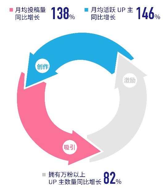 从2020年第一季度财报来看,B站在内容生产领域确实是变了,并且变得十分迅速和优秀。据财报显示,2020年第一季度,B站月均活跃UP主同比增长146%,成功突破180万。同时,其月均投稿量达490万,同比增长138%。