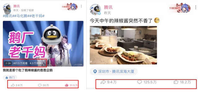 腾讯的选择显然是正确的,不到一天的时间,这条搞笑短视频在B站实现了461万的播放量、31.5万点赞,而早先所发的“今天中午的辣椒酱突然不香了”的动态,则实现了9.4万转发、125.5万评论、18.2万的点赞数。