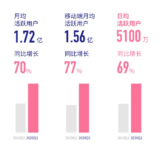 2020年一季度,B站月均活跃用户同比增长70%达到1.72亿,移动端月均活跃用户同比增长77%达到1.56亿,日均活跃用户同比增长69%达到5100万。相比之下,新浪微博月活跃用户达5.5亿、日活跃用户达2.41亿。虽然B站与微博尚有差距,但B站贵在平台上的用户更为真实、年轻人高度集中,且B站有微博所不具有的能力。